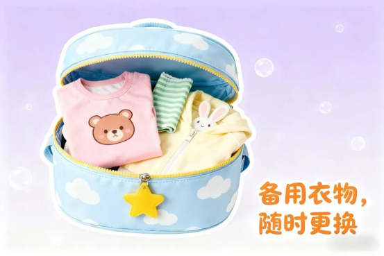 温馨提示:可在背包里常备1-2件上衣、一条隔汗巾和一件薄外套,方便老师在需要时及时为孩子更换。