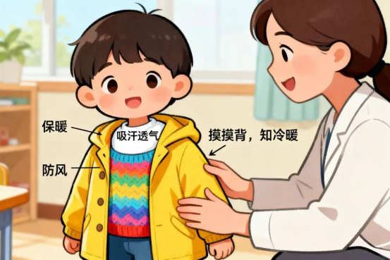 通过触摸幼儿后背,评估衣着是否适宜。如后背温暖干燥,则衣着适量;如潮湿有汗,则表明衣着过多。