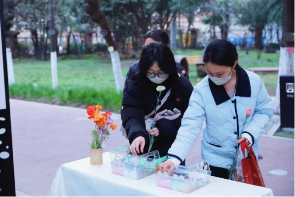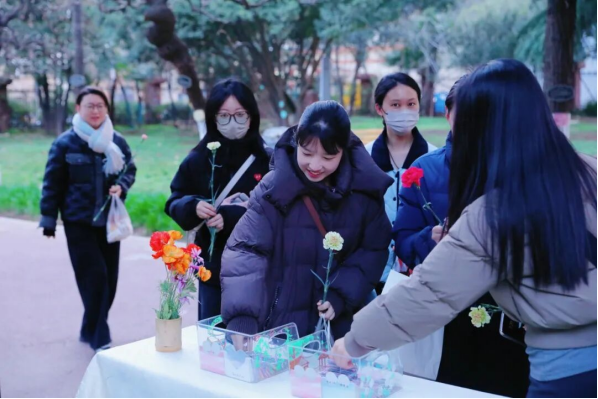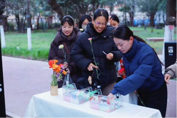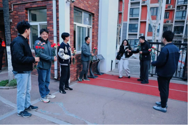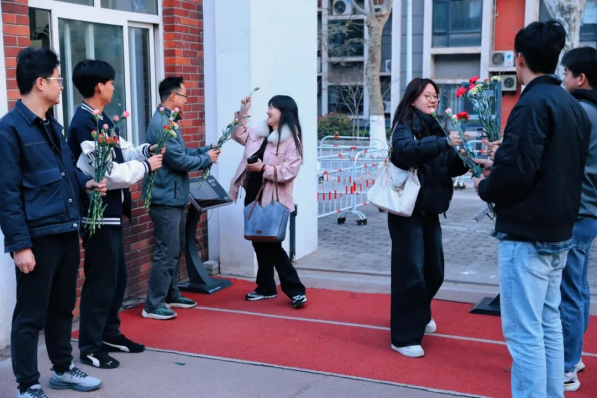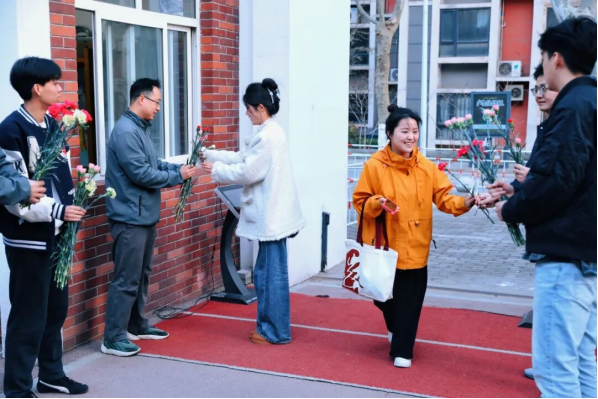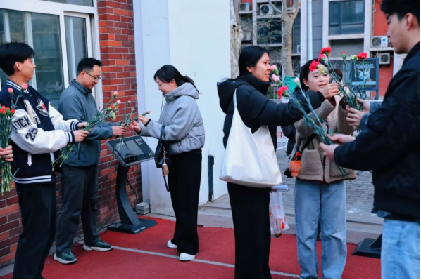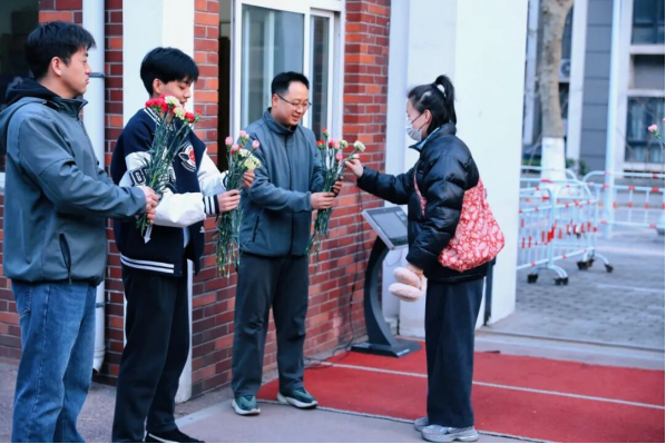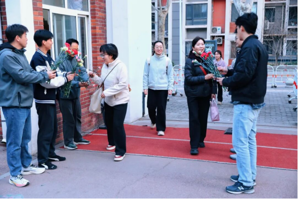 3月6日的清晨,一份特别的惊喜早已静候在门口。男教师们手捧康乃馨为每一位踏入校园的女教师送上节日的第一声祝福。