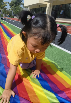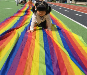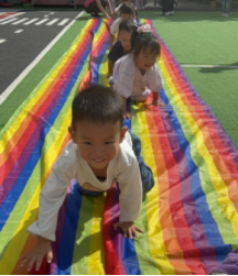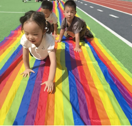 瞧,老师抱着大大的彩虹毯走过来,铺展开时像把春天的小花园铺在了地上,我们的眼睛都亮啦!大家赶紧踮着脚尖排好小队伍,老师笑着喊“准备好啦”,我就跟着前面的小伙伴一起开心地爬过彩虹毯。