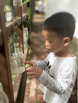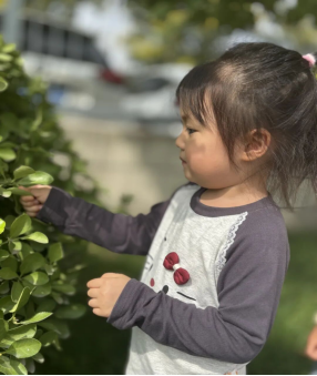 我在花坛边认真看幼儿园的花草树木。小草长得油亮亮的,像刚洗过澡的绿绒绒,用指尖轻轻摸一摸,软乎乎的,还蹭得手心痒痒的。风一吹,小草就“沙沙沙” 地晃,好像凑到我耳边说 “你好呀”。