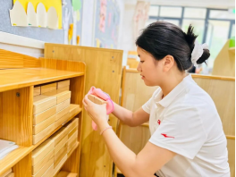 阳光漫进窗沿时,幼儿园已偷偷换了模样:地面、卫生间拖得干干净净,玩具柜、小床摆得整整齐齐,每一处干净都藏着“等你回家”的认真~