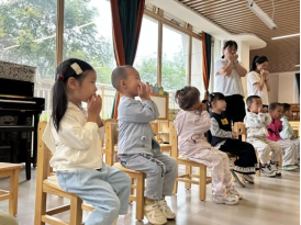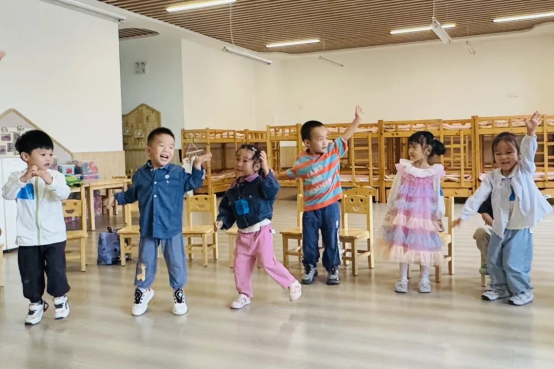 随着欢快的旋律,宝贝们跟着老师拍拍手、跺跺脚,沉浸在美妙的音乐世界中。