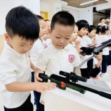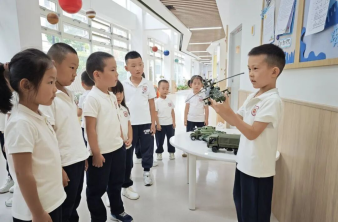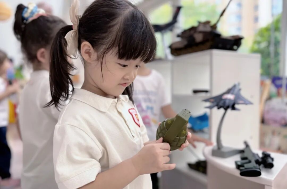 最让孩子们兴奋的当属“装备模型展”。“小小讲解员”手持模型认真地向同伴介绍,他们专注地观看各类装备模型。或站在展台前,仔细打量战斗机模型的机身与机翼;或俯身凑近,观察坦克模型的履带纹路与细节,满是对装备模型的好奇与喜爱。