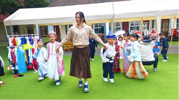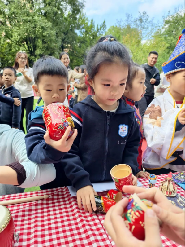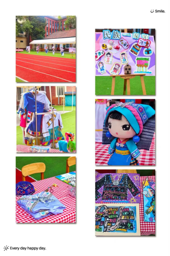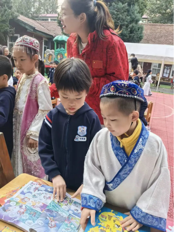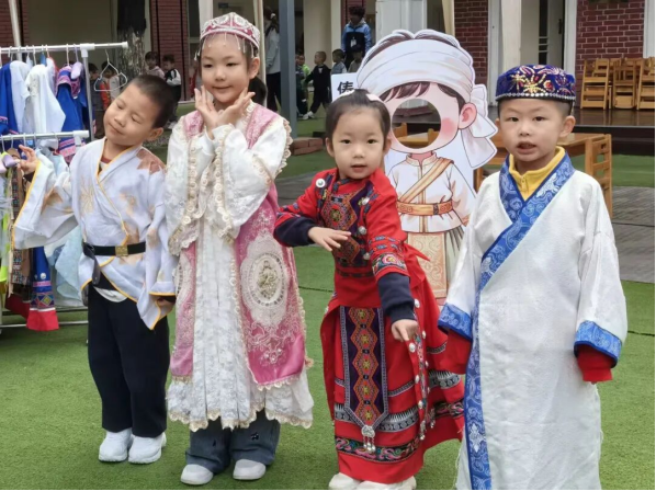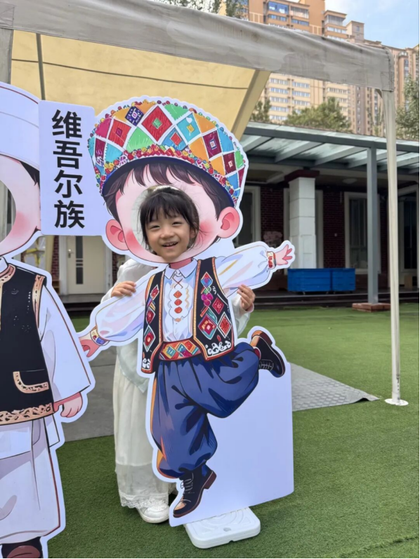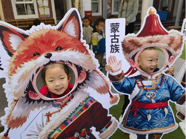 多彩的民族文化,是祖国大家庭最动人的篇章。小朋友们通过服饰、美食和建筑,走进了一个缤纷的民族世界。他们身着各色民族服装,在特色服饰展板后探出笑脸,留下珍贵瞬间;在欢快的民族歌舞中,亲身体验着不同文化的魅力,深刻感受到五十六个民族亲如一家的团结与和谐。