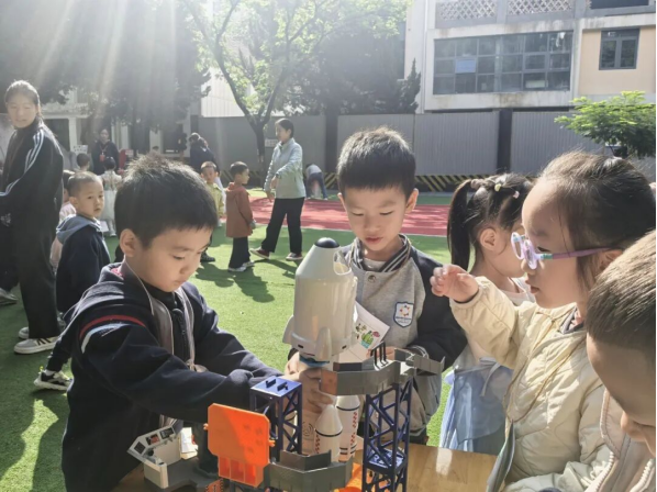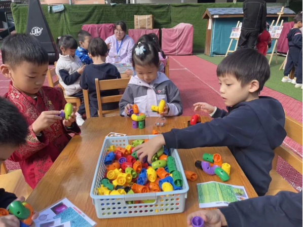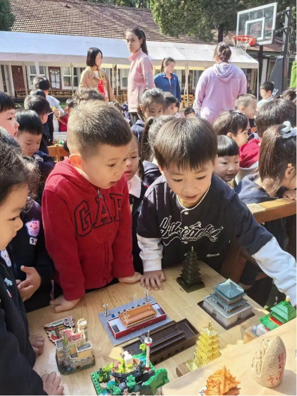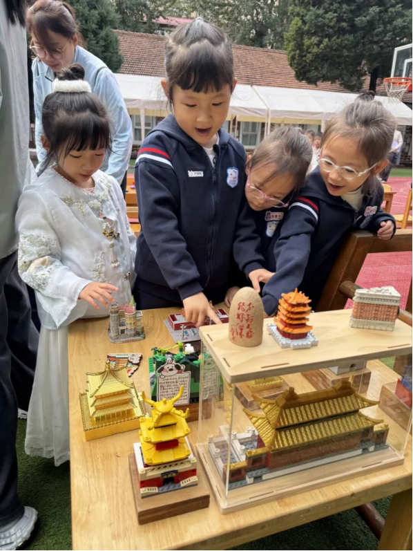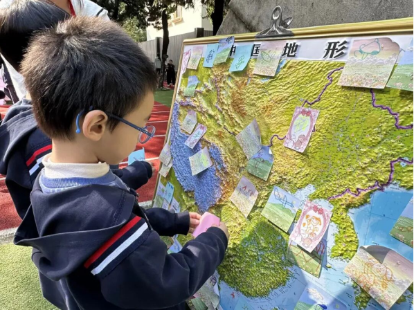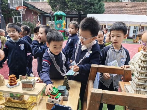 祖国的山河是一幅流动的画卷,滋养着深厚的文化底蕴。活动区内,名胜古迹模型、实地游览海报、幼儿绘画作品与精美绘本依次陈列,小朋友们兴致盎然地当起“小导游”,分享自己眼中的大美中国。在各地标志性建筑的图片旁,乐高、STEM积木、雪花片等建构材料一应俱全,小朋友们对照图纸,专注地搭建着“天坛”“长城”与“东方明珠”,在巧手创造间,加深了对祖国地理与建筑智慧的认知。